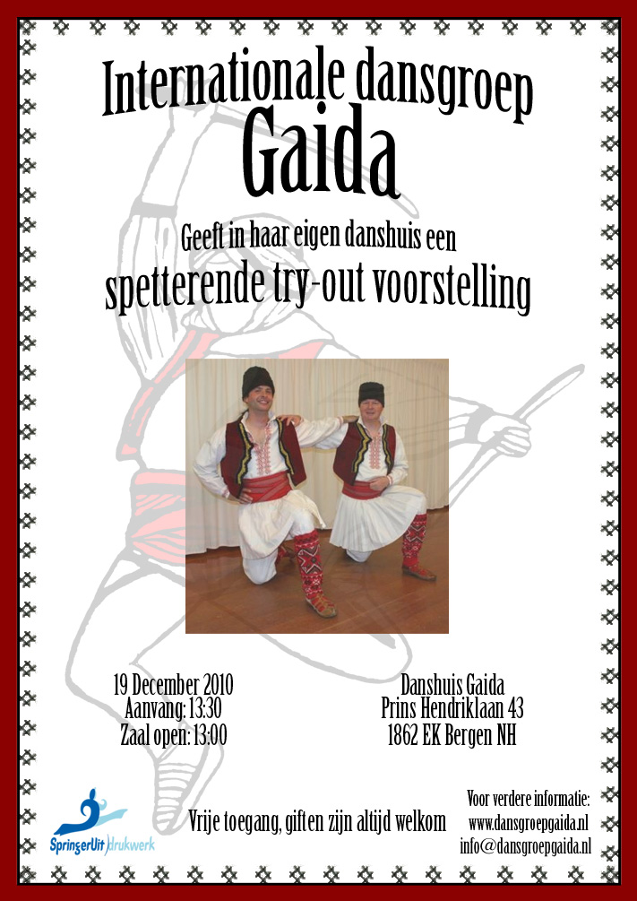 De Bergense Internationale Dansgroep Gaida treedt op zondagmiddag 19 december 2010 op in het Gaida Danshuis te Bergen. De voorstelling begint om 13:30 uur en zal na een non-stop programma om 14:30 uur eindigen.