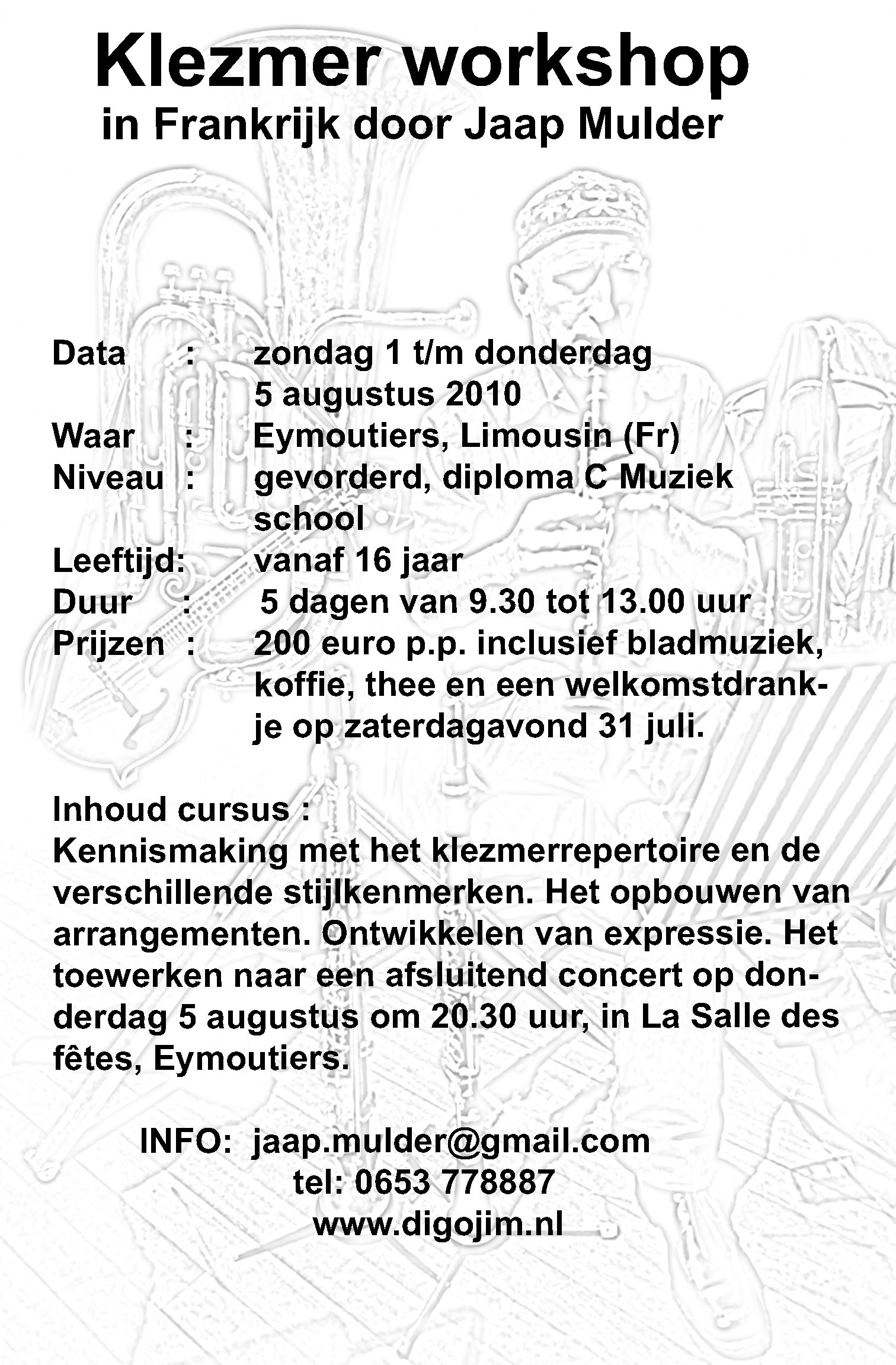 Mijn vraag is of jij mijn bijlage een keer wilt doorsturen naar jullie bestand? Het betreft een workshop Klezmer muziek in de eerste week van augustus, in Frankrijk. De lessen worden gegeven door Jaap Mulder, klarinettist van Di Gojim.