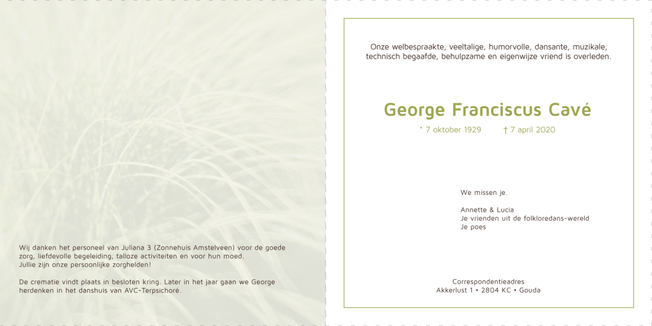 In de bijlage het overlijdensbericht van onze markante George Cavé.