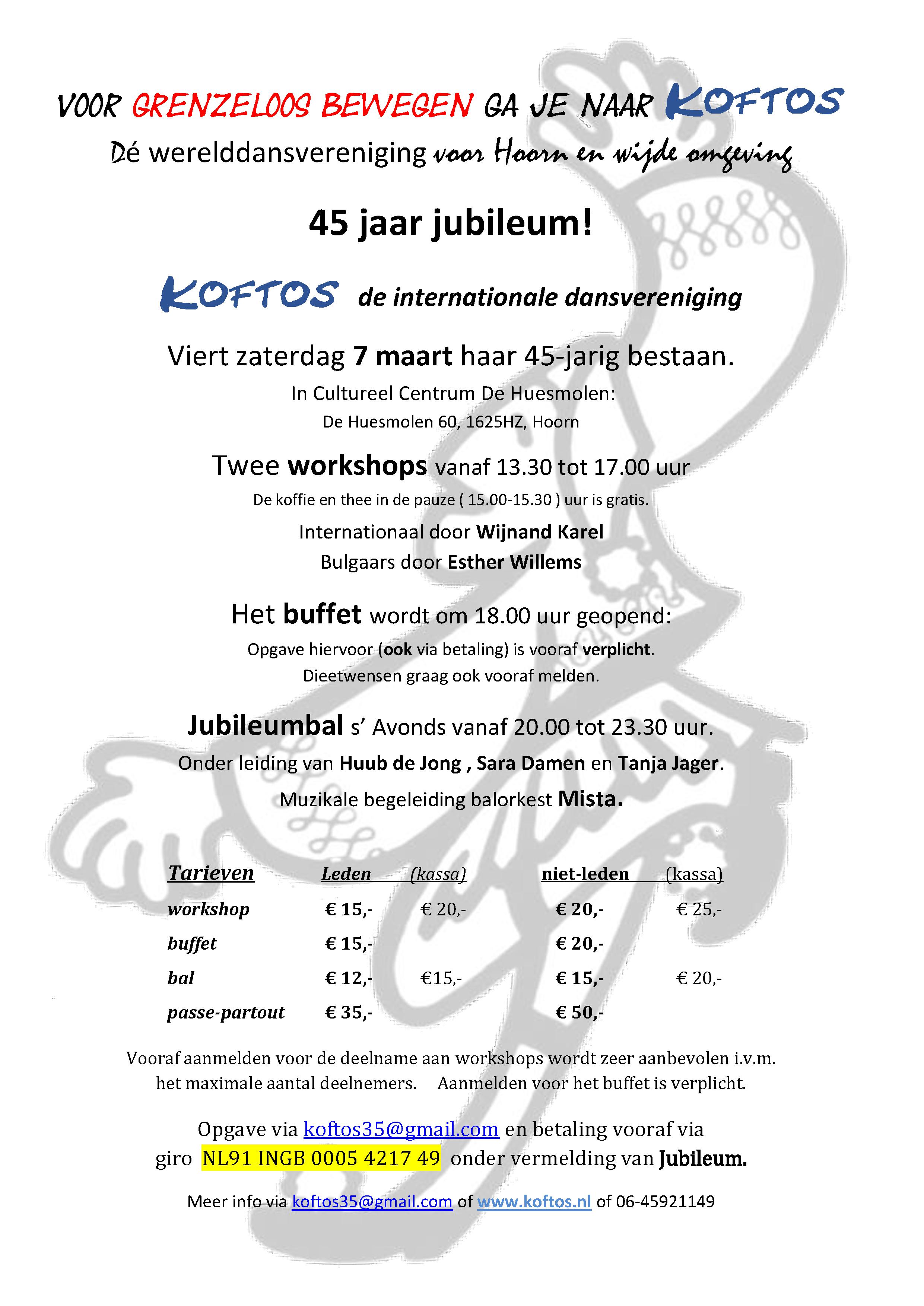 [aankondigingen] Koftos viert 45-jarig jubileum op 7 maart 2020
